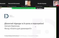 Наталія Кертчак, представниця міжнародної громадської організації «Освітній фонд для демократії» (Fundacja Edukacja dla Demokracji), розповіла про досвід застосування діалогових процедур у Польщі та потенціал використання в територіальних громадах України, зокрема Луганської та Донецької областей, як деокупованих, так і тимчасово захоплених російськими військами; про відмінності діалогу від інших видів комунікації між владою та громадою.