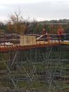 Сьогодні, 1 жовтня, після обстеження території піротехніками, працівники «Укртрансмосту» почали роботи під зруйнованою частиною мосту. Зокрема, вони продовжили роботи з укладання деревини та улаштування перил на пішохідну частину мосту.