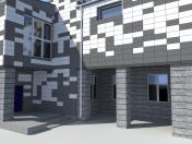 Фасад планується зробити вентильованим. А саме, на сталевий каркас, прикріплений до несучого шару стіни, буде закріплено облицювальні матеріали, що, в свою чергу, створить зазор між облицюванням і стіною, і надасть можливість вільно циркулювати повітрю, яке прибиратиме конденсат і вологу з будівлі.