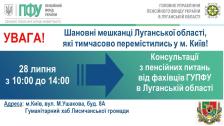 28 липня спеціалісти ГУ ПФУ в Луганській області відповідатимуть на запитання внутрішньо переміщених осіб з нашого регіону, які тимчасово мешкають в Києві.