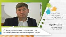 «Співпраця Львівщини і Луганщини – це наша відповідь на виклики гібридної війни», – наголосив заступник голови Луганської облдержадміністрації Юрій Клименко під час IV Форуму місцевого розвитку, що відбувається у Львівській області 25-27 червня.